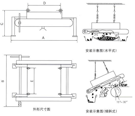 | 型號\參數\項目 | 適應帶寬 mm | 額定吊高 h=mm | 物料厚度 ≤mm | 磁場強度 ≥mT | 適應帶速 ≤m/s | 重量 kg | 外形尺寸 A×B×C | 懸掛尺寸 D×E |